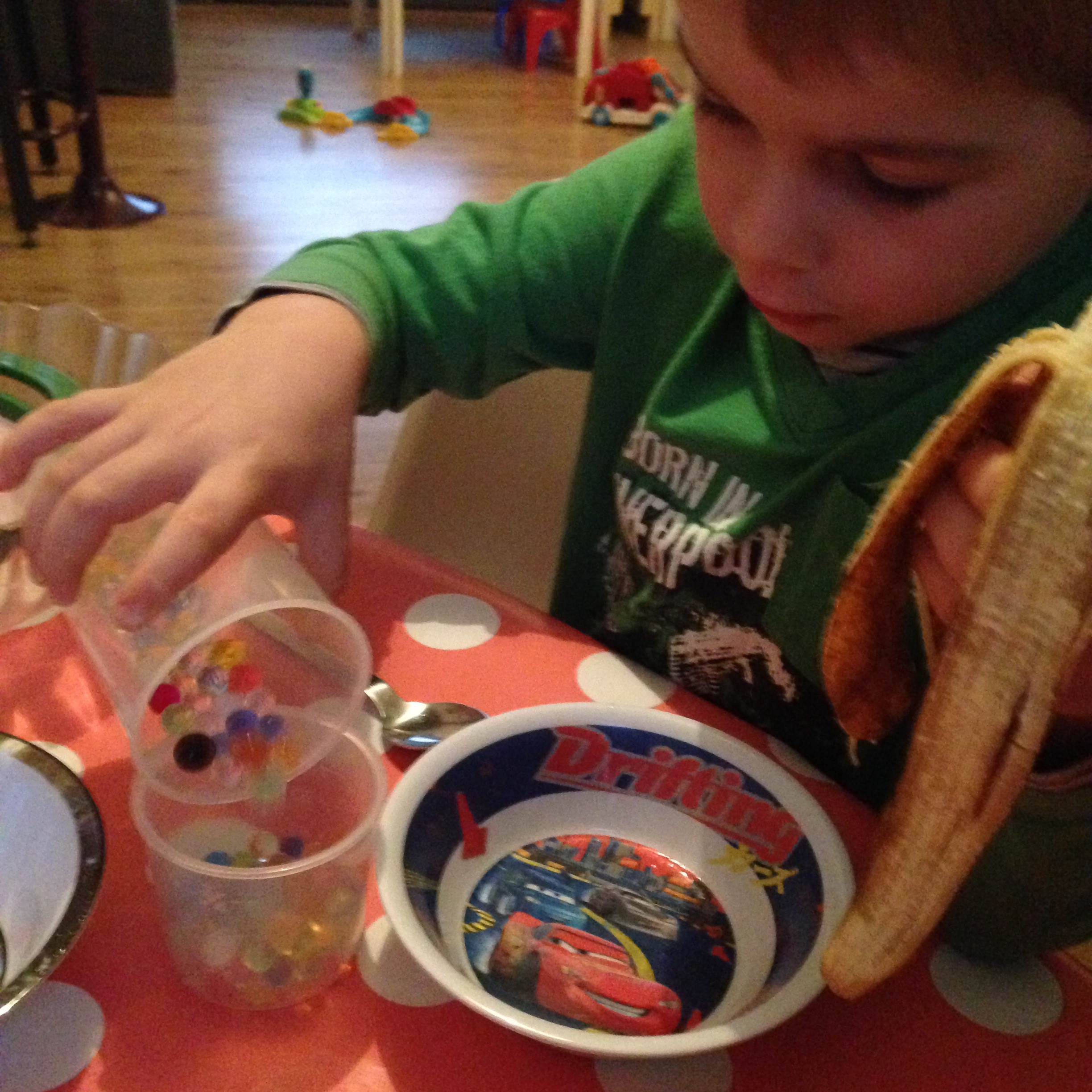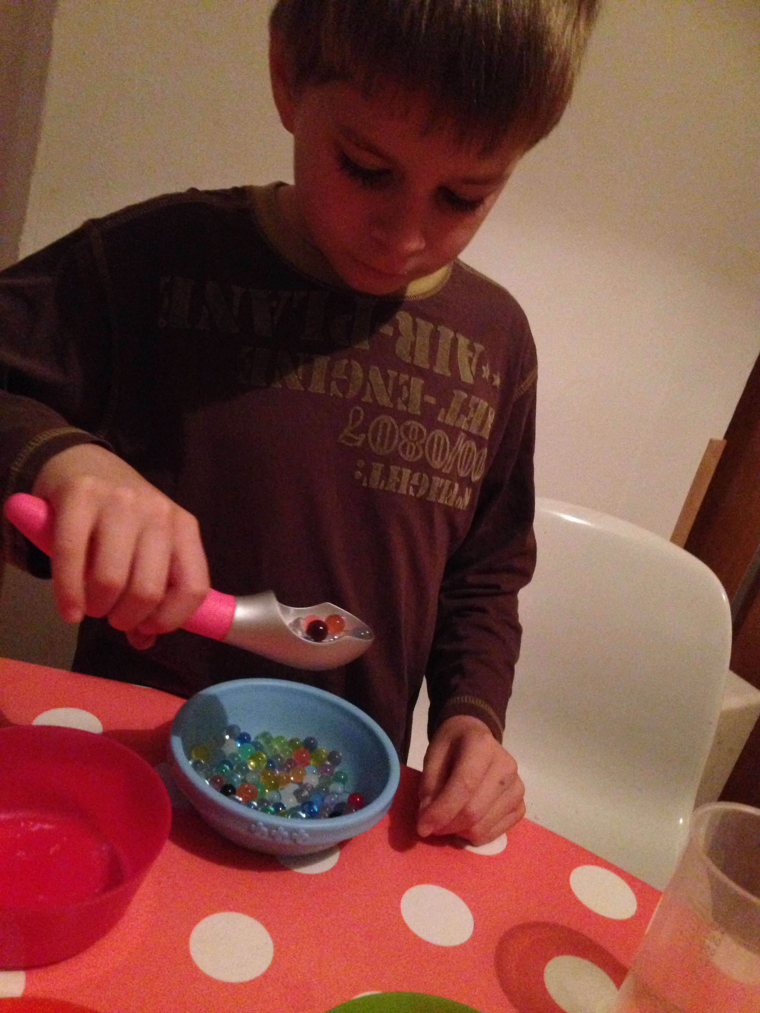 L’atelier des perles d’eau qu’on voit un peu partout quand on tape « Montessori » me faisait de l’œil depuis une éternité. On pourrait penser que vu l’âge de mes nains ça serait dépassé mais pas du tout! L’entraînement en motricité fine plaît aussi aux grands.. enfin, c’est surtout de chipoter avec des matières bizarres qui était rigolo pour eux mais l’entraînement était tout de même là, bon pour le petit qui en est au début du graphisme et bon pour le grand qui commence à vraiment écrire en attaché!